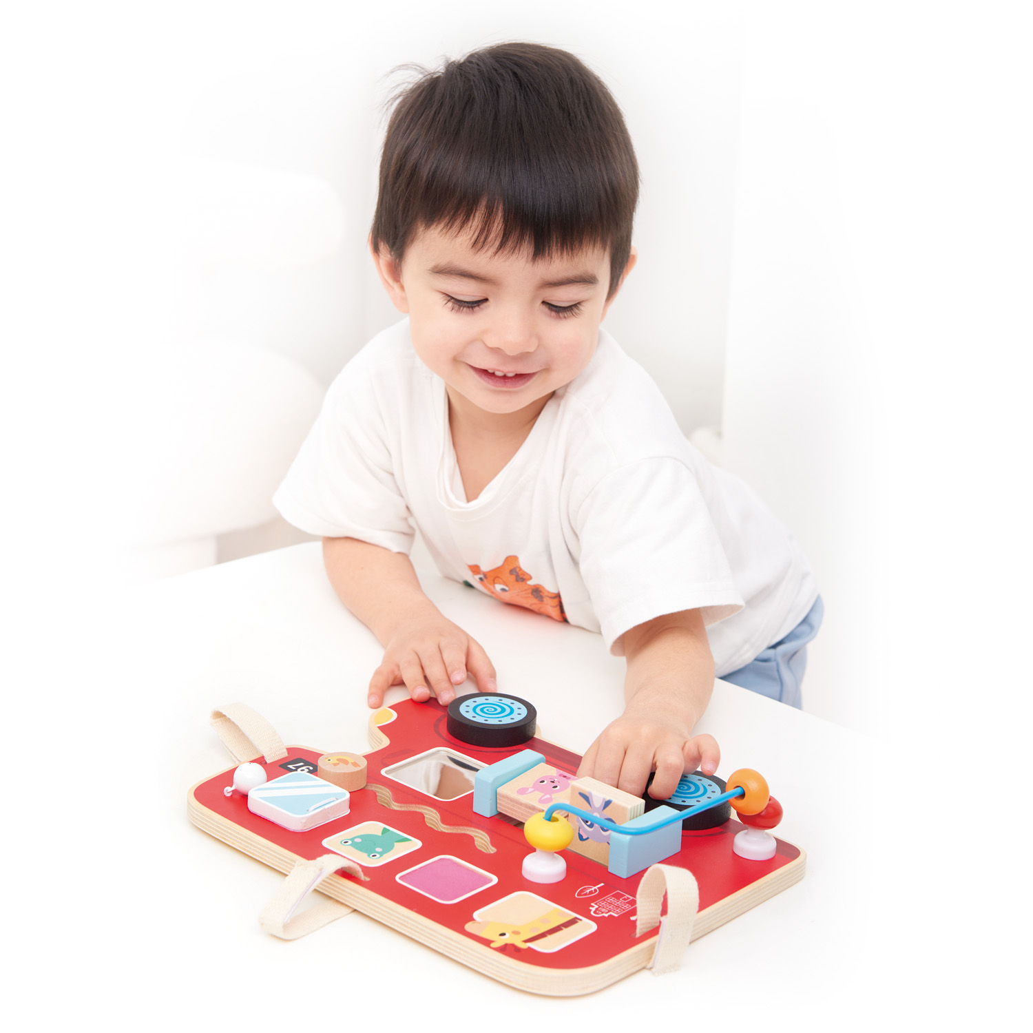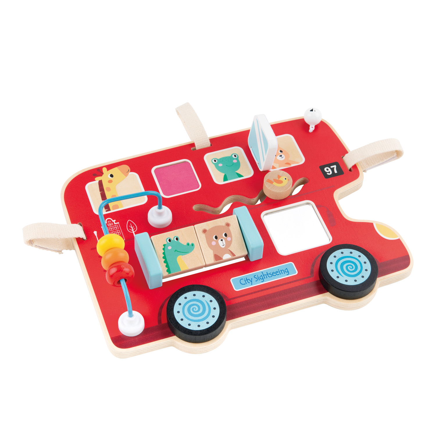 This colourful wooden toy activity board from Lelin® is shaped like a cheerful red bus and packed with fun activities for little explorers. It features sliding animal blocks, spinning wheels, a bead maze and peek-a-boo windows that keep small hands busy and curious minds engaged.