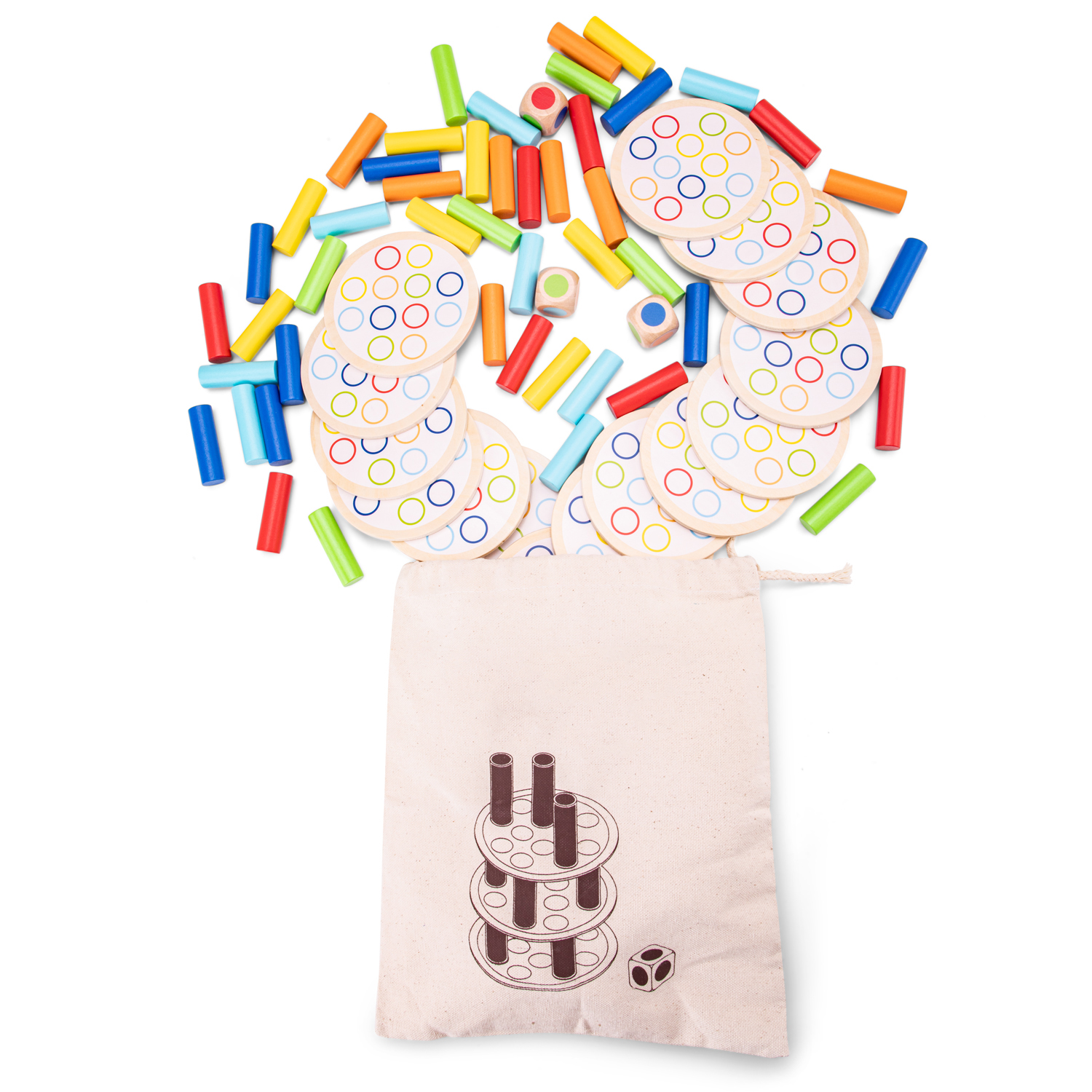 - Includes: 48 wooden pillars, 15 base blocks, 3 dice and a cotton storage bag