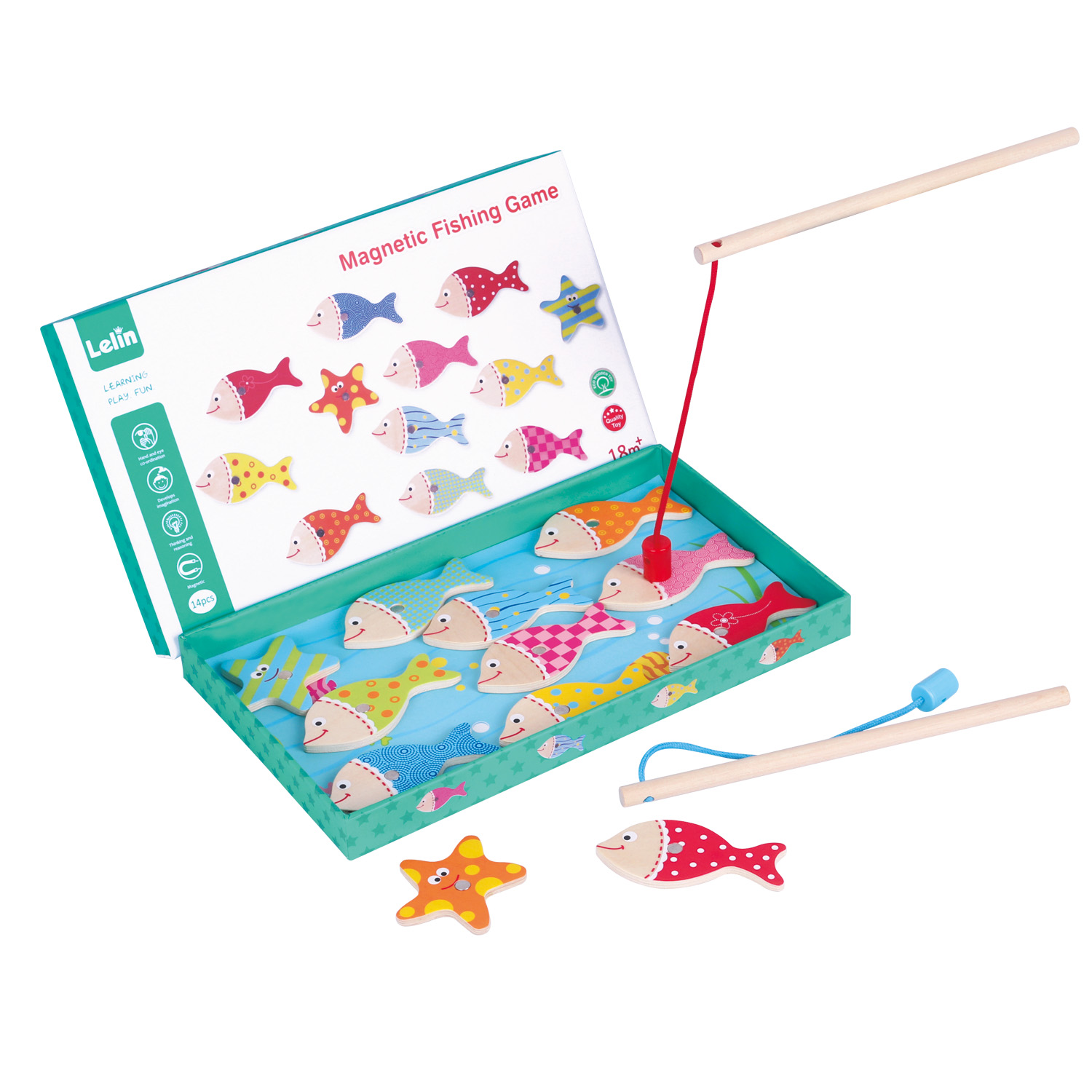 This colourful magnetic fishing game from Lelin® includes twelve wooden sea animals, featuring ten playful fish and two starfish. With the two magnetic fishing rods, children can take turns trying to catch their favourite pieces. Thanks to the compact wooden toy design, all parts stay together in the box, making it perfect for play at home or on the go.