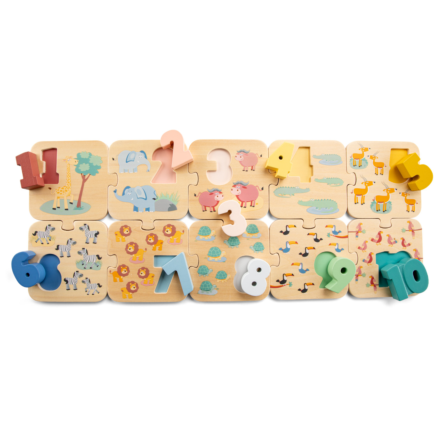 Introduce your child to the joy of learning with the wooden safari number puzzle from New Classic Toys. This educational toy combines number recognition with a fun safari theme, making it perfect for young learners. The set includes ten interlocking puzzle pieces, each featuring a large, colorful number block from 1 to 10. Next to each number, illustrations show a corresponding number of safari animals, helping children visually connect numbers with quantities. From one cute giraffe to ten tropical birds, the engaging safari scenes add a playful touch to learning. This puzzle supports the development of essential skills such as number recognition, counting, and fine motor coordination. As children fit the pieces together, they also practice their problem-solving abilities and hand-eye coordination. Ideal for both individual play and parent-child activities. Made from FSC® 100% certified wood..