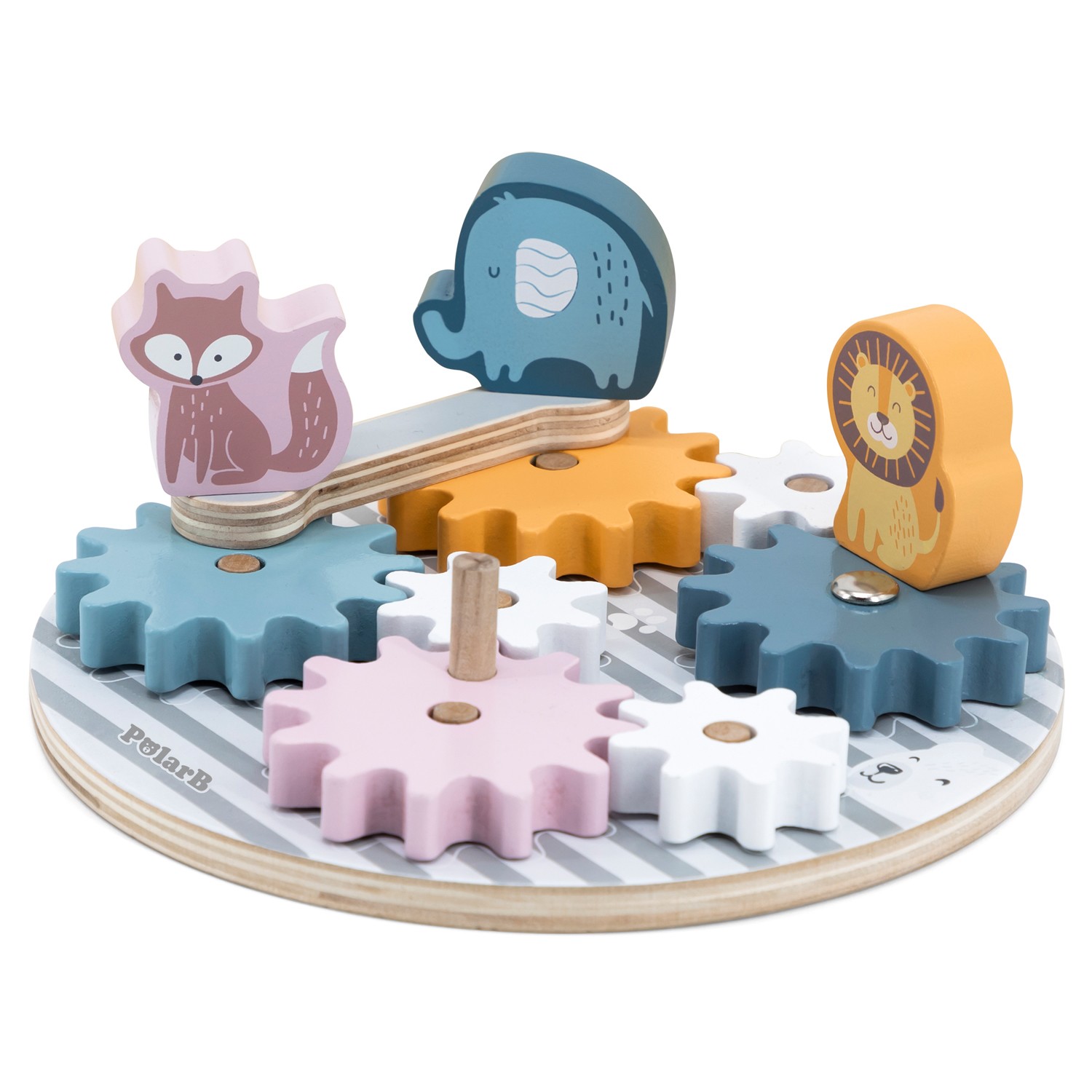 Put the gears onto the fixed axes by matching the outline printed on the base playing as a puzzle. Turn the gears and make the animals move. Introduce mechanical and physical knowledge to help babies improve their reasoning and logical thinking besides of fun.