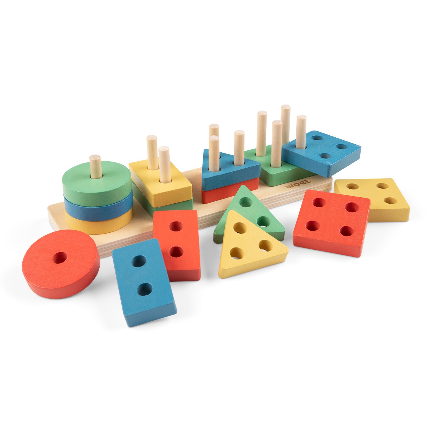 The geometric shape stacking puzzle board from New Classic Toys is a stacker, a sorter, and a geometric puzzle all in one. It features 4 different shapes: triangles, circles, rectangles and squares. Match and sort these 16 colorful wooden pieces with their corresponding places on the board. Puzzles help children develop valuable skills through an activity that they enjoy, like developing their fine motor skills and improve their hand-eye coordination. It is also good for training their problem-solving skills and it stimulates the recognition of shapes and colors.