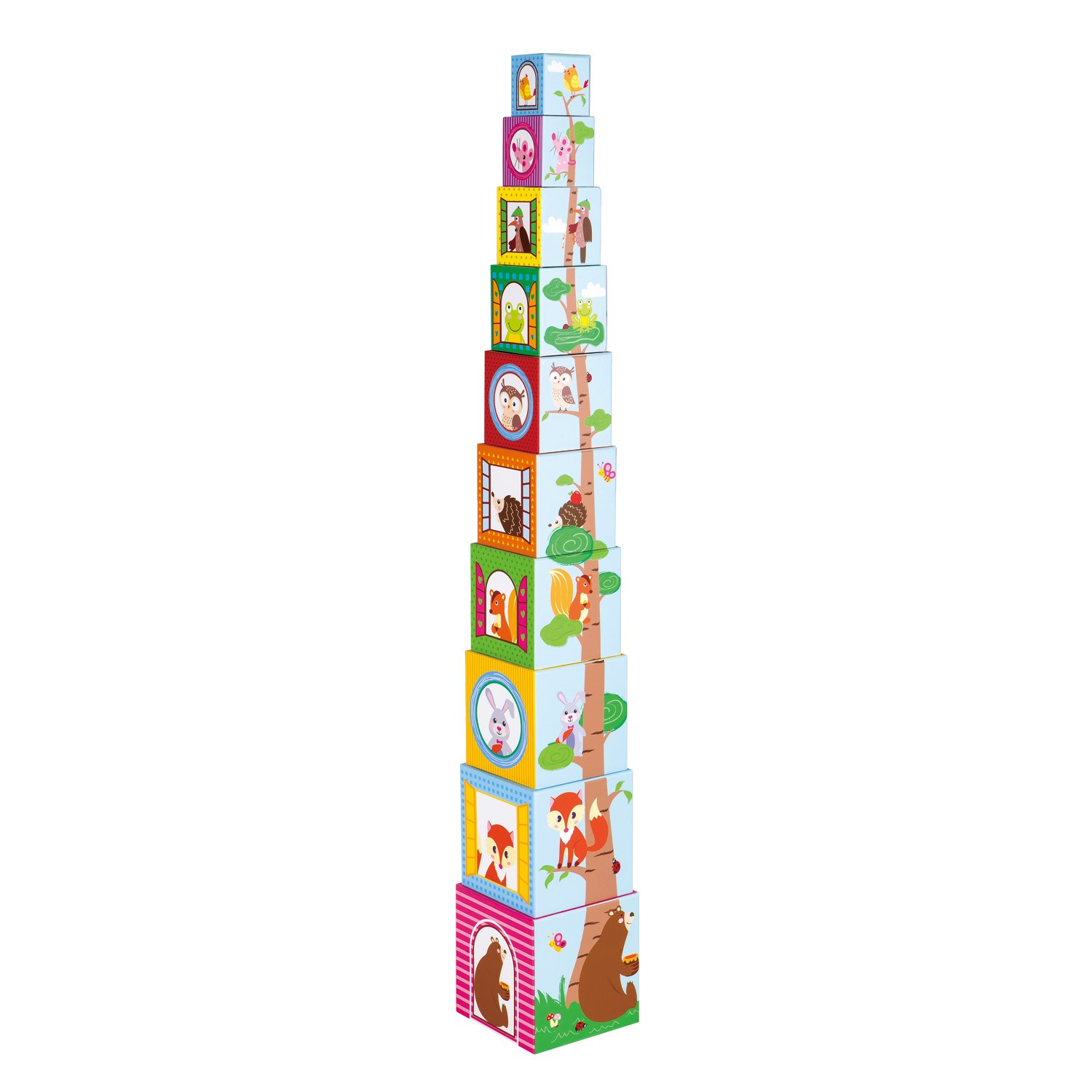 This colourful toy stacking and nesting block set from Lelin® is perfect for little hands to build, stack and explore. The set includes beautifully illustrated handmade cardboard cubes featuring friendly forest animals, numbers and nature elements, encouraging early learning through play.