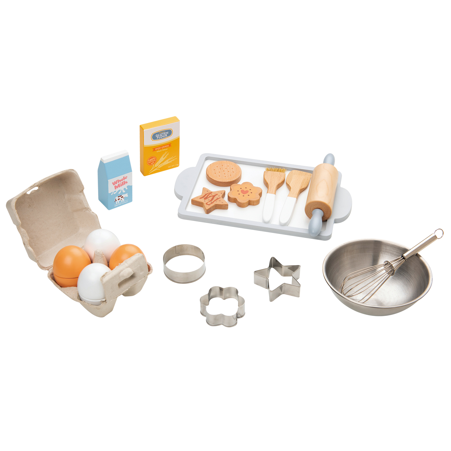 Includes: rolling pin, whisk, bowl, brush, spatula, cookie molds and accessories