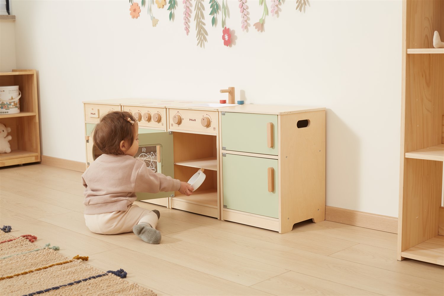 With its soft pastel tones and rounded design, this wooden kitchen is both safe and engaging for curious toddlers. Perfect for home use or early learning environments.