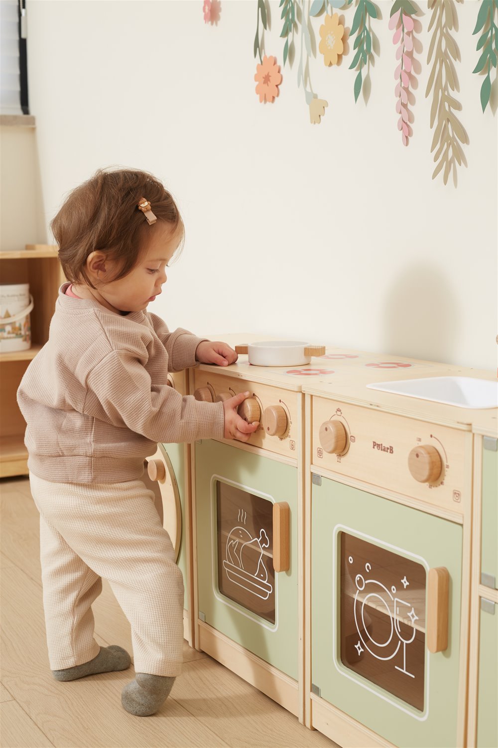This charming wooden toddler kitchen from PolarB® is specially designed for little ones from 18 months. With realistic features and a sturdy build, it offers endless opportunities for imaginative role play.