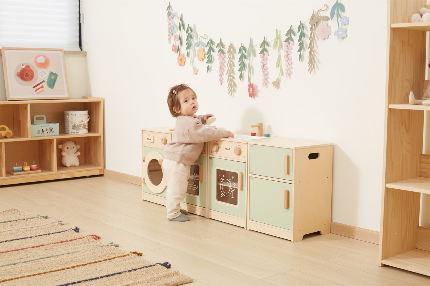 The set includes a fridge, stove with oven, sink with tap, dishwasher and washing machine, all with chunky handles and turning knobs that make a satisfying ‘click’ sound. Children can pretend to cook, clean and organise while developing imagination, language and social skills through play.