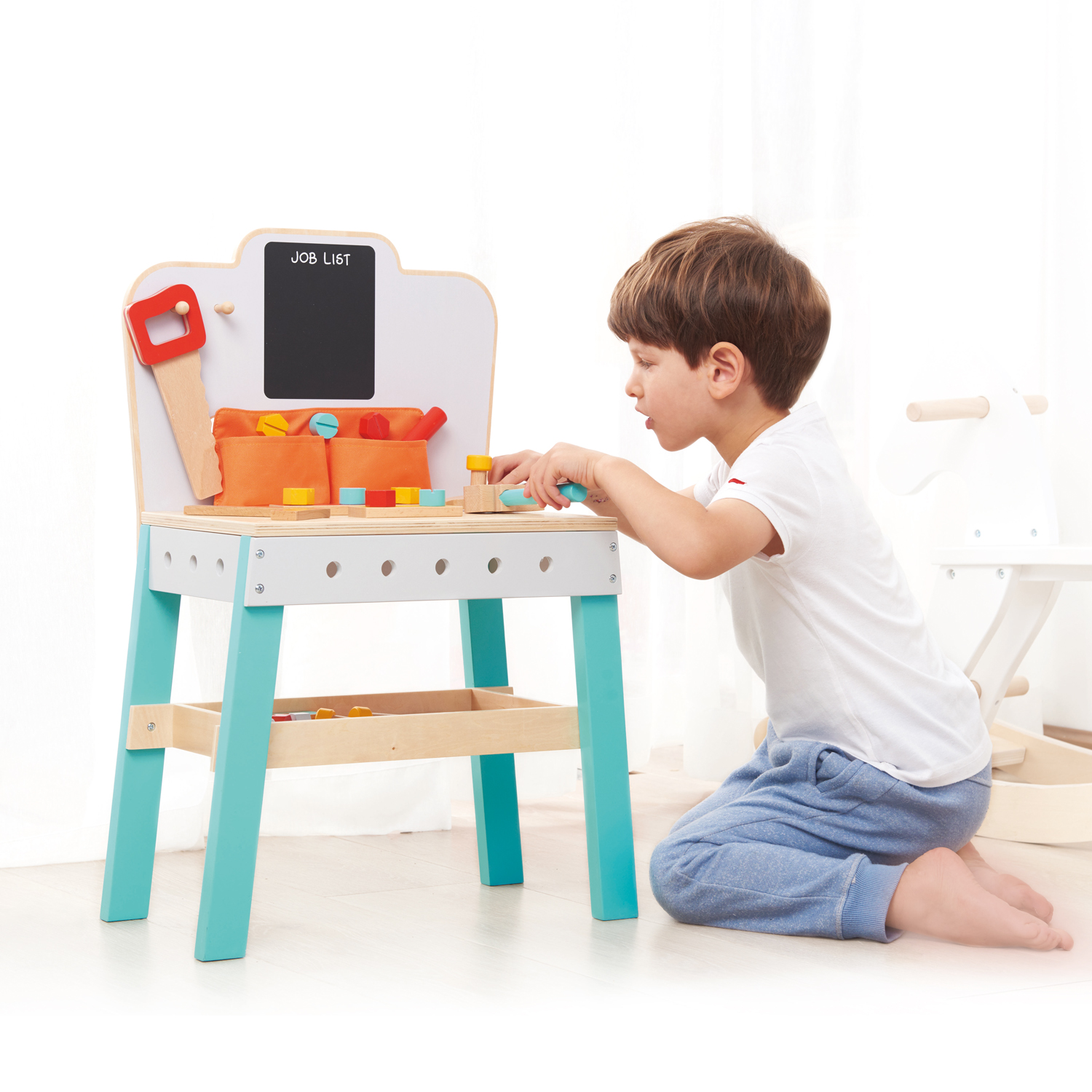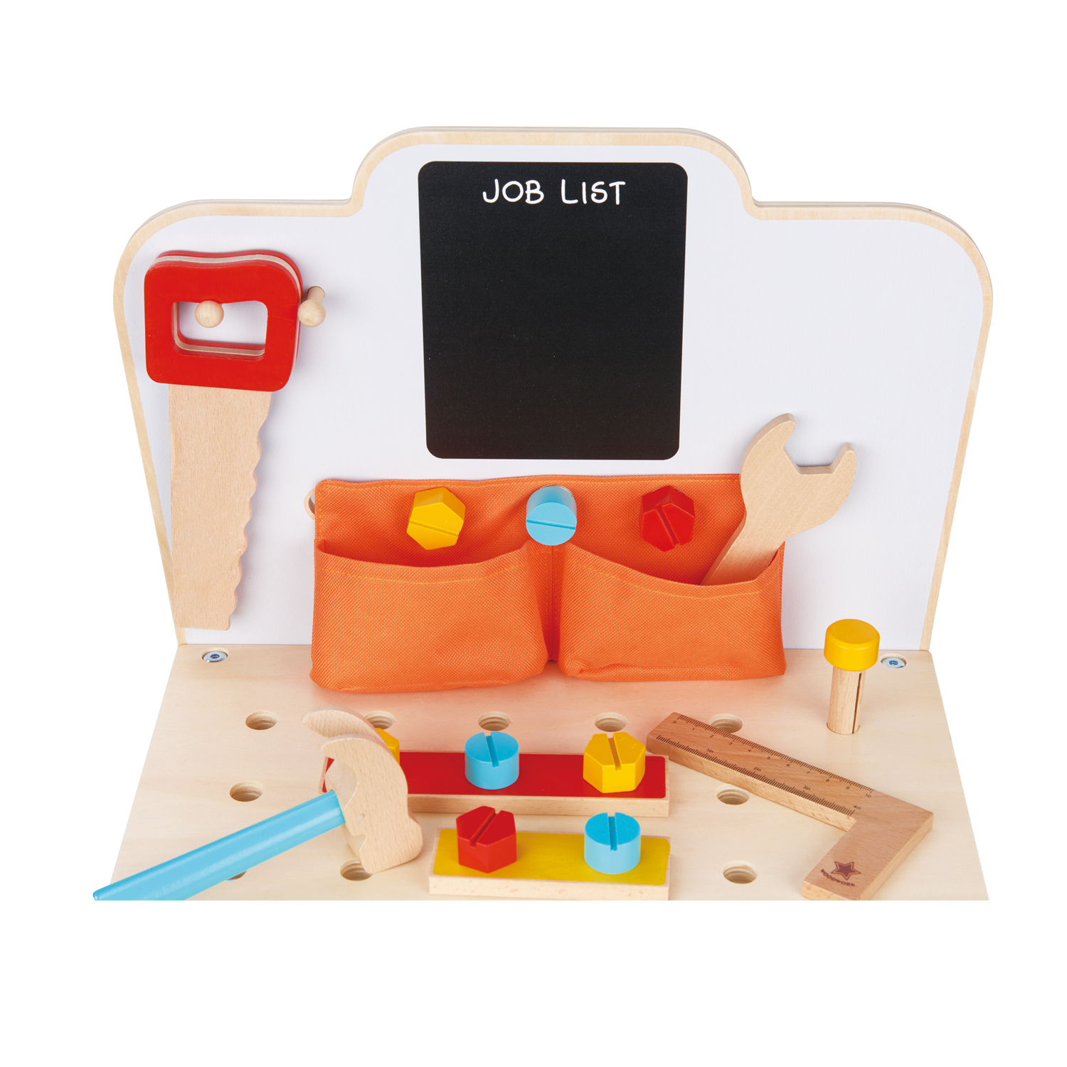 The 34 piece set Workbench includes 1 Wooden Hammer, 1 Spanner, 1 Screwdriver, 1 Ruler, 1 Saw, 9 Bolts, 9 Nuts, 3 Nails, 6 Wooden Accessories and 1 Cotton Bag. Helps to develop hand-eye coordination, enhances imagination skills. Ideal for pretend play.