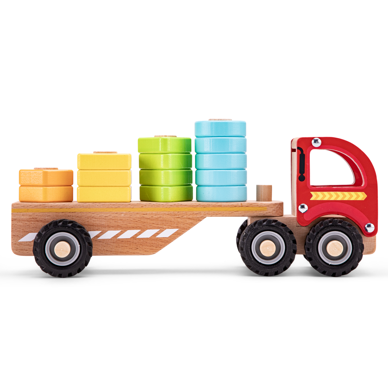 This wooden sort & stack truck with bright and cheerful geometric shapes from New Classic Toys is the perfect addition to any toy collection. Little ones love to sort, stack and playing with toy vehicles. Sorting shapes and colors helps with naming, recognition and spatial awareness all at the same time. Put all these together in a little toy and you have a fun way to teach your little one the art of problem solving while playing. Putting the different geometrical shapes blocks back in the correct spot will also improve fine motor skills and hand-eye coordination. After playing, matching, sorting and stacking, it’s time to drive off into the next adventure!