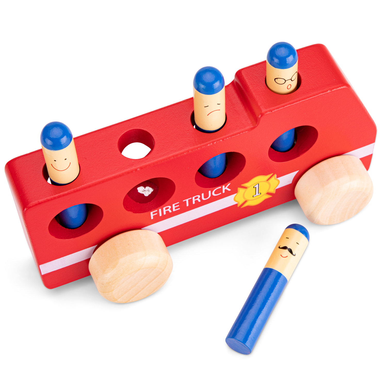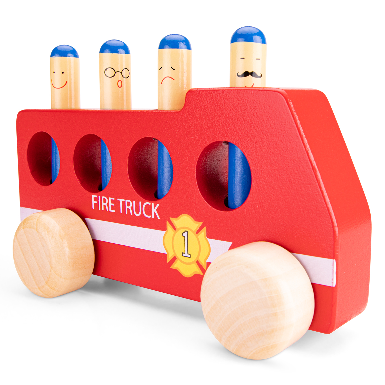 Push, pop and play! This wooden pop-up fire truck from New Classic Toys is spring-loaded and ready for fun! Press the figures down, watch them pop right back up and try to catch them as they soar into the air – it's a fun game that keeps little minds active and entertained.